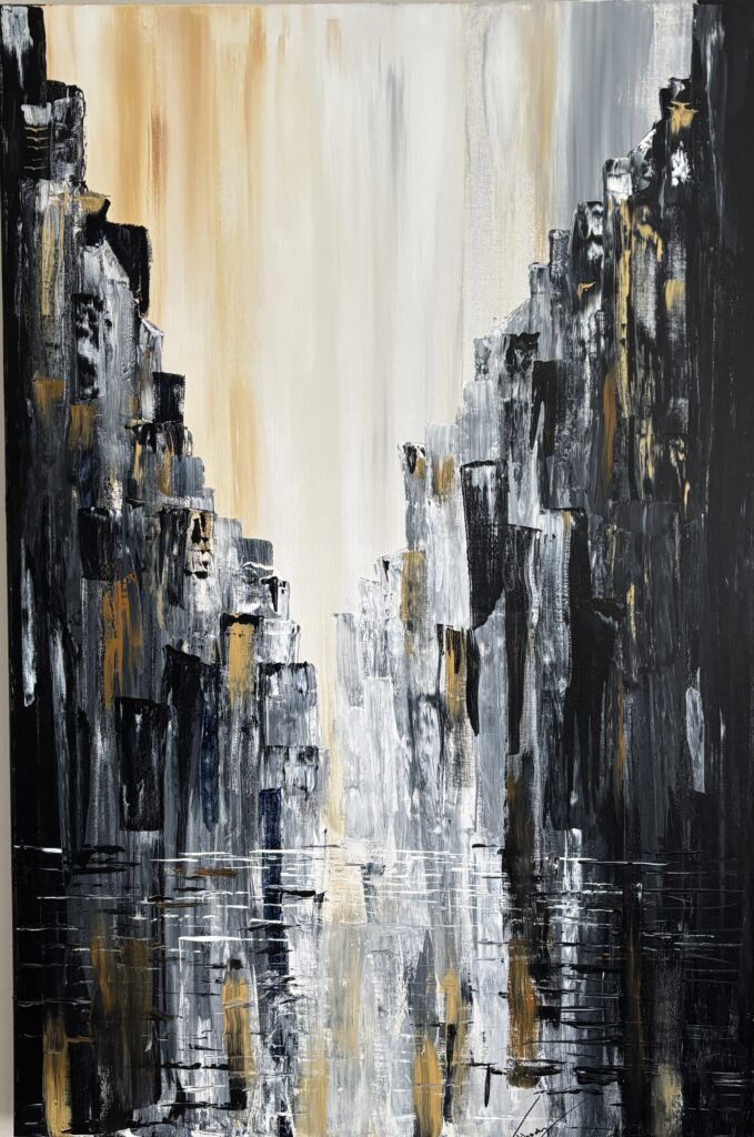 Acrylic Large 48 x 36 Acrylic on canvas in floating frame unnamed “City on Fire” Acrylic on Canvas in Floating frame 31 x 31 “Dusky Rain” Acrylic on Canvas 24 x 36